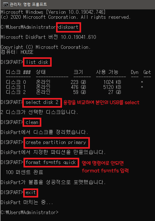 6. format fs=ntfs quick(안되면 format fs=ntfs)
